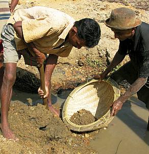 Portable hand operating tools use for mining process such as shovel, picks, pans (specially made from bamboo) and cradles. Once soil lifts out from the mine, with the use of water, the dirt and mud wash out using pans and thus if there any gemstone, which heavier than normal stones, remains at the bottom of the pan as mud wash away.